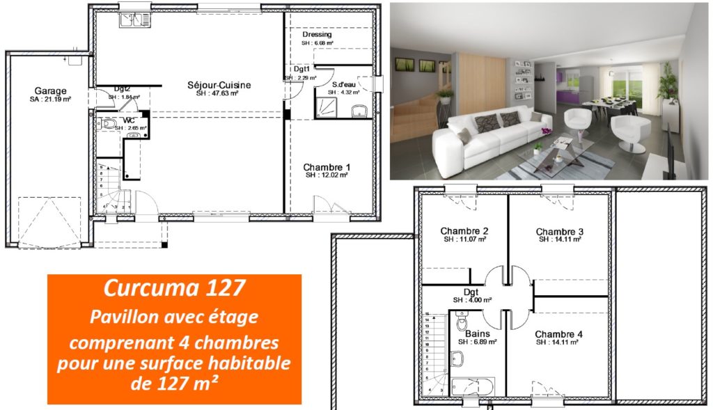 Bâtir Ensemble vous propose le modèle Curcuma, un pavillon avec étage proposant 4 chambres et une surface habitable de 127 m².