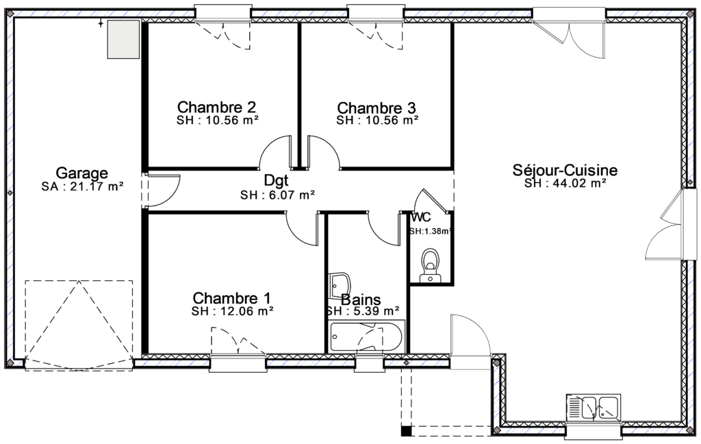 Bâtir Ensemble vous propose le modèle Nymphéa 2 pans, un pavillon de plain pied proposant 3 chambres et une surface habitable de 90 m².
