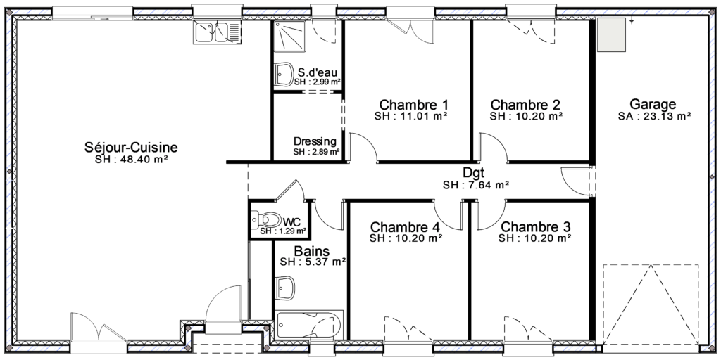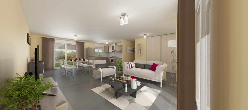 BATIR ENSEMBLE vous propose le modèle Clématite 110 m² en RE 2020, sur vide sanitaire de 50 cm, comprenant : salon/séjour/cuisine de 48 m², 4 chambres dont 1 chambre parentale avec dressing et salle de bain, 2ème salle de bain, WC, garage intégré de 23 m².
