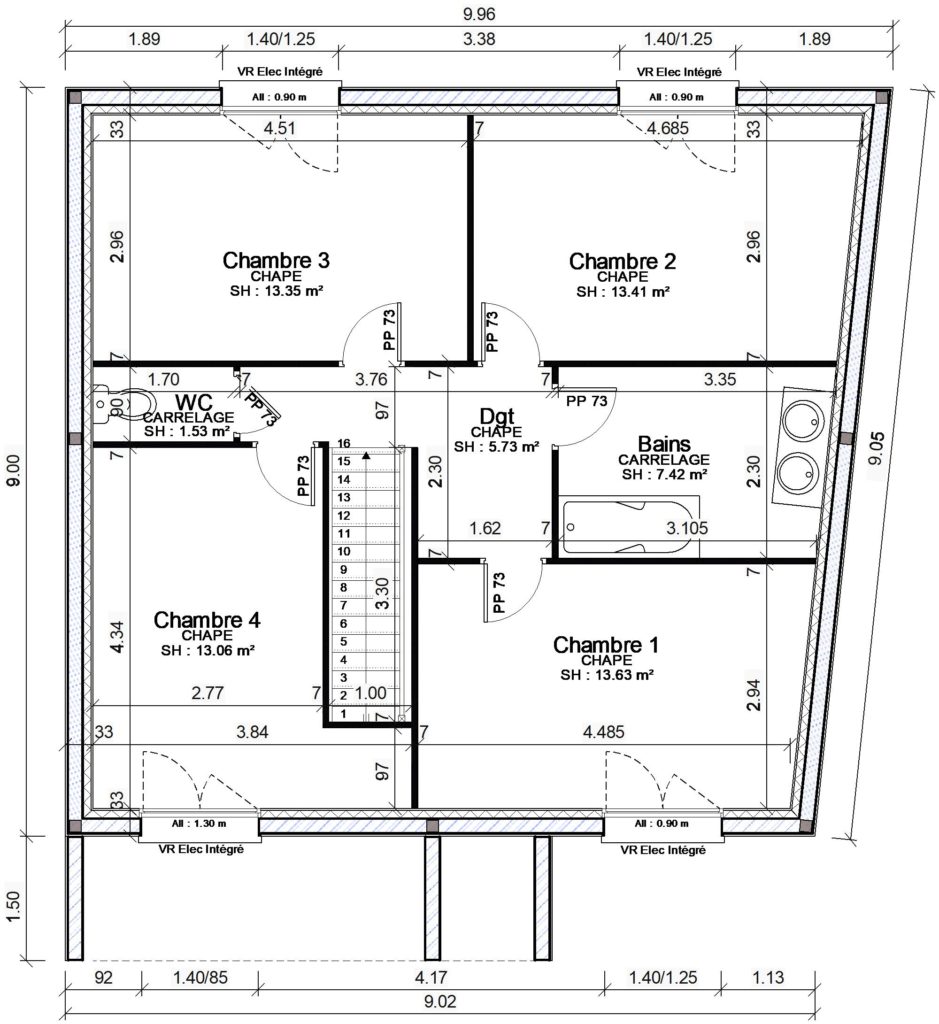 Elle est composée, au rez-de-chaussée d’une pièce de vie de 44m², une belle entrée, un WC et un grand garage. A l’étage, 4 grandes chambres de 13m² chacune, une salle de bain de 7m² et un WC séparé.